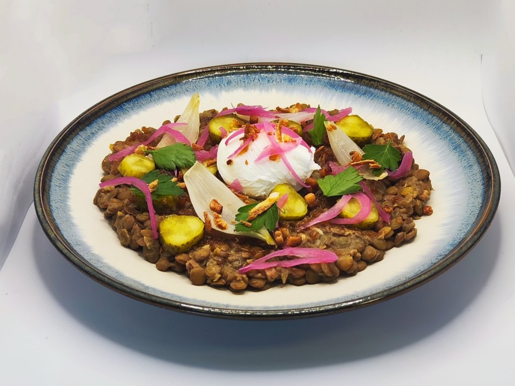 Čočka na kyselo, ztracené vejce, pečená cibule, slaninové škvarečky, nakládané okurky nakládaná červená cibule, smažená cibulka, chléb